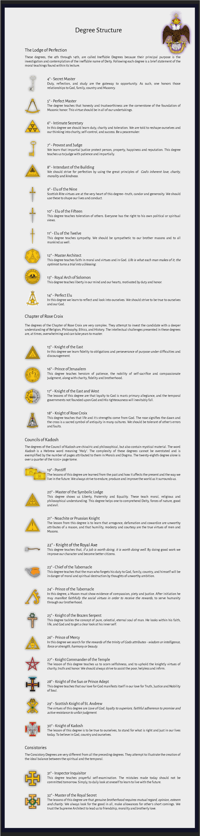 Although there is no higher degree than that of a Master Mason, the 29 degrees of the Scottish Rite serve to enrich the philosophy of the Symbolic Lodge. A Mason who chooses to further his Masonic experience by becoming a 32° Scottish Rite Mason will be expanding upon the fundamental principles of Freemasonry.